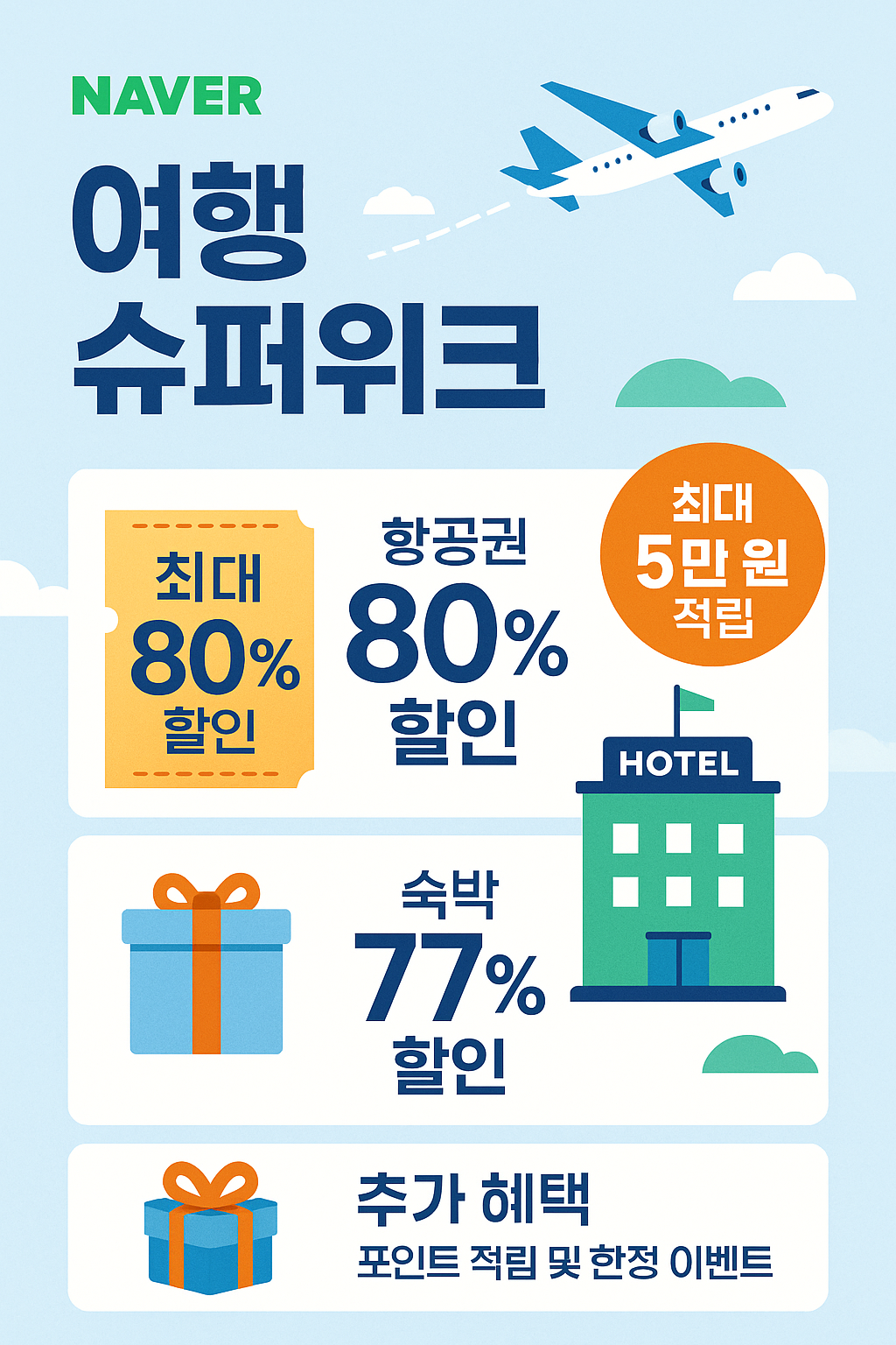 네이버가 6월 15일까지 진행하는 '2025 네이버 여행 슈퍼위크'는 항공권부터 호텔, 펜션, 패키지 여행까지 다양한 상품에 대한 대규모 할인과 포인트 적립 혜택을 제공하는 1년 중 가장 큰 여행 이벤트입니다. 이번 기회를 놓치면 정말 아까운 혜택들이 가득하니, 자세히 알아보겠습니다.